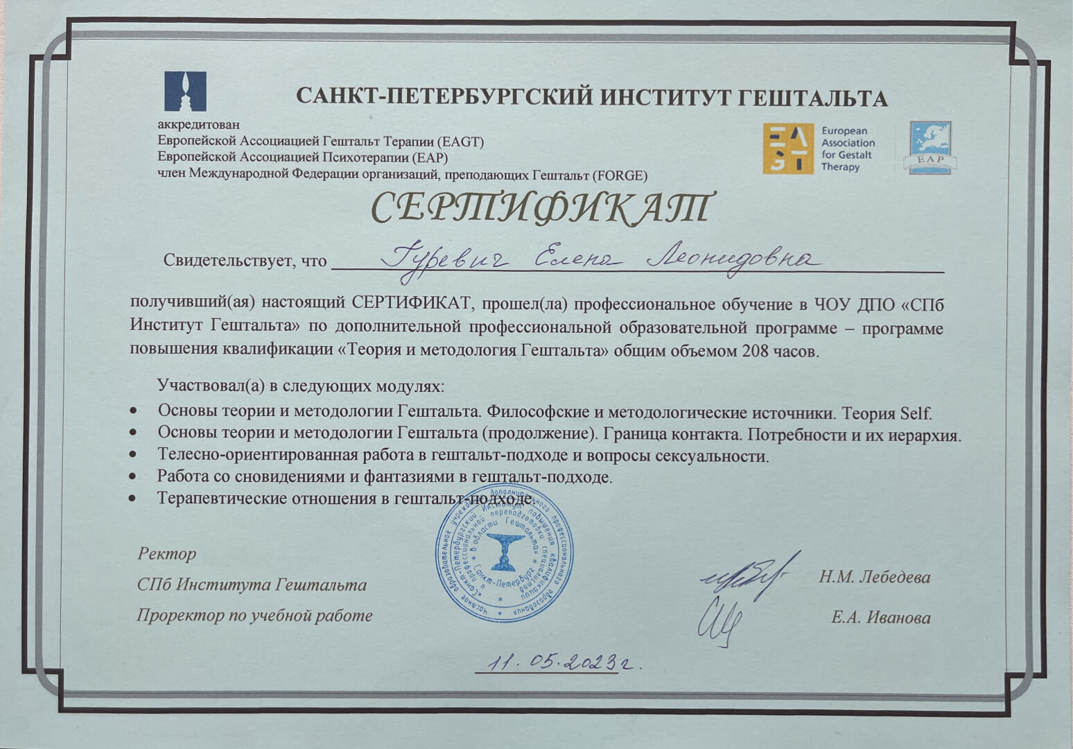 Сертификат Санкт-Петербургского Института по теме «Гештальт»