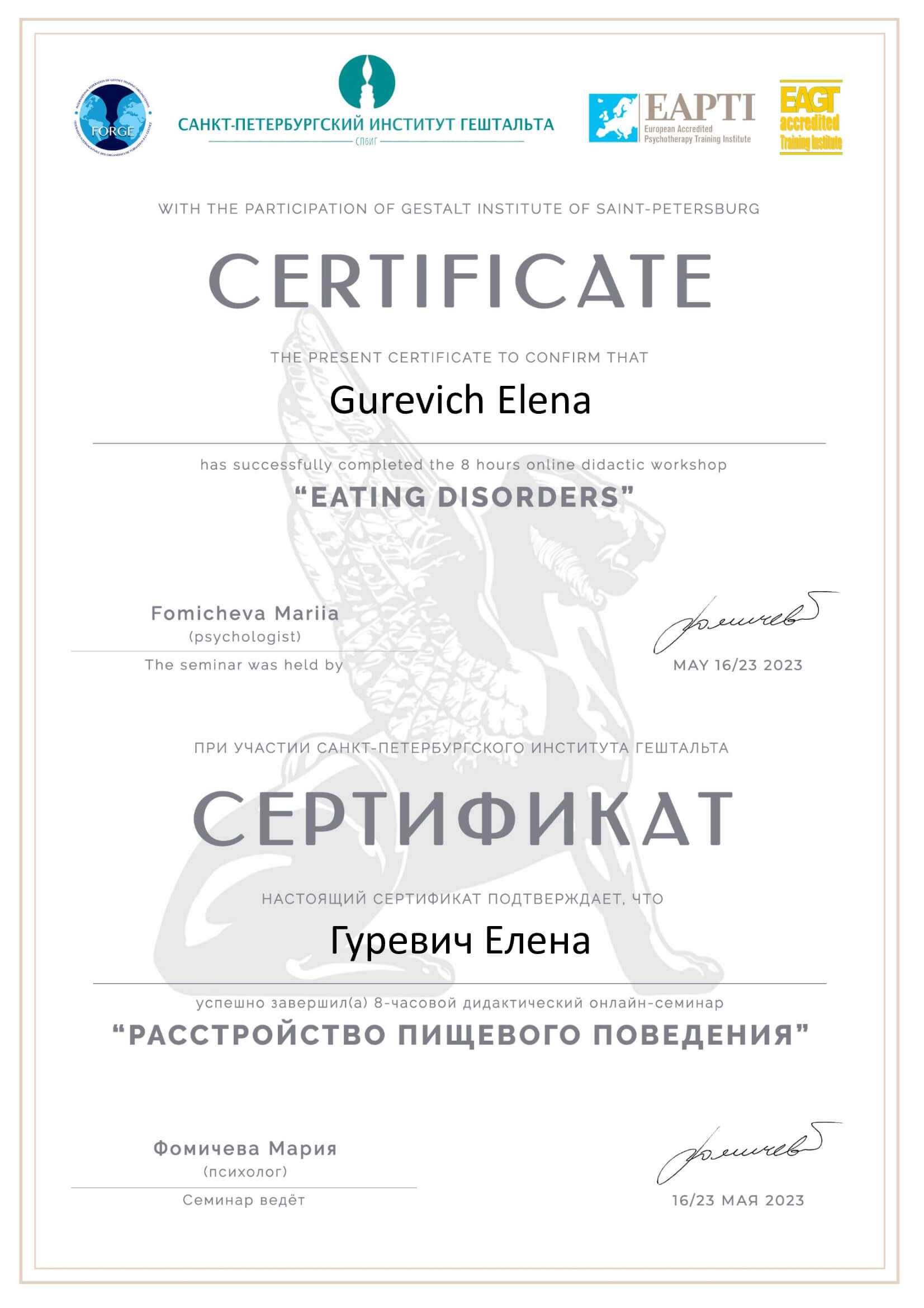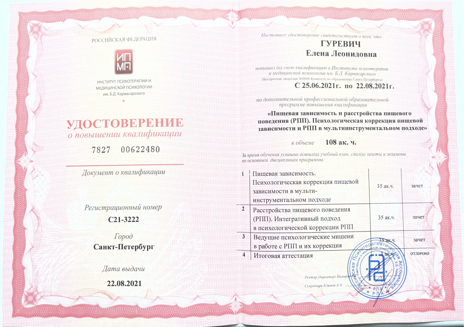 Удостоверение о повышении квалификации по программе «Пищевая зависимость и расстройства пищевого поведения (РПП). Психологическая коррекция пищевой зависимости и РПП в мульти инструментальном подходе».